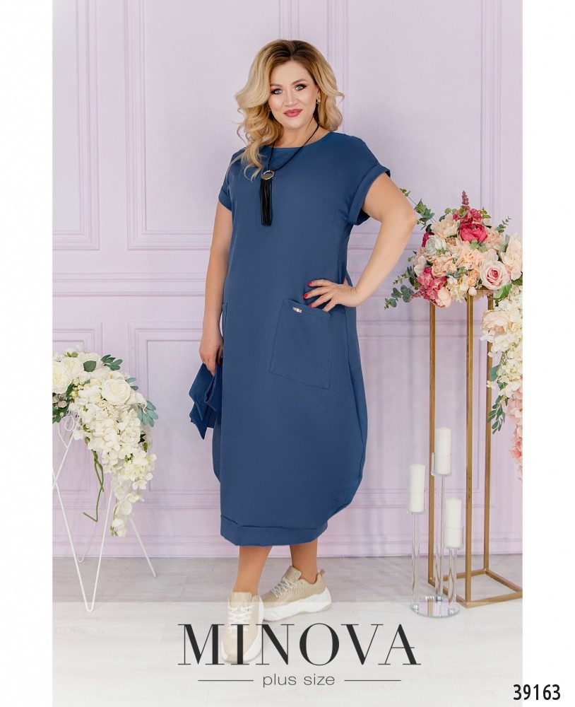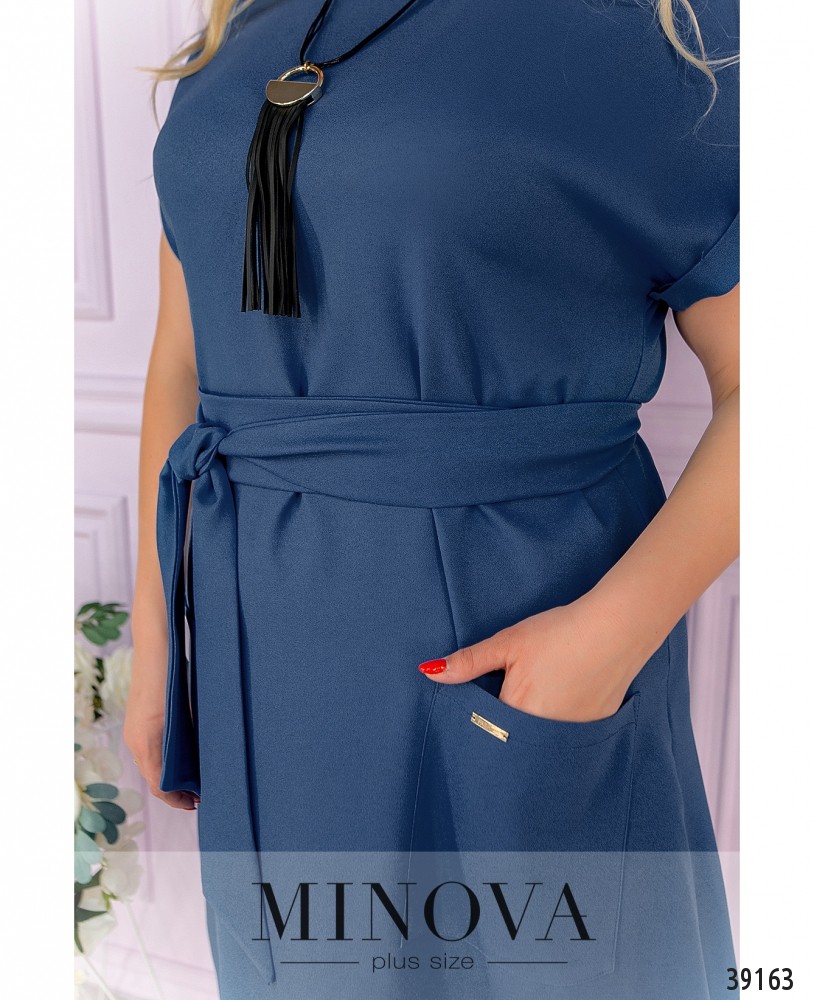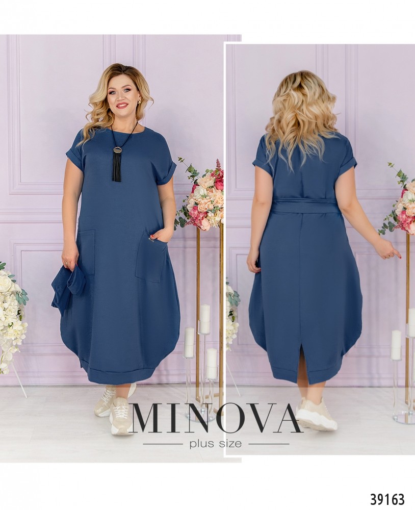 Стильное платье батал с подолом-баллоном, по бокам - накладные карманы, рукава с небольшими отворотами, в комплекте пояс и подвеска, вырез горловины полукруглый, застёжек нет. Пояс входит в комплект.