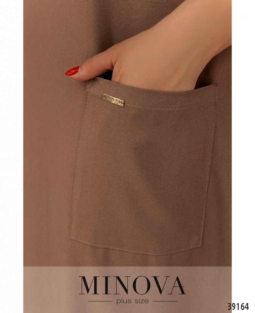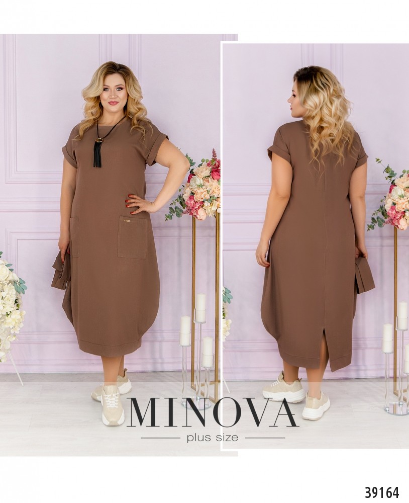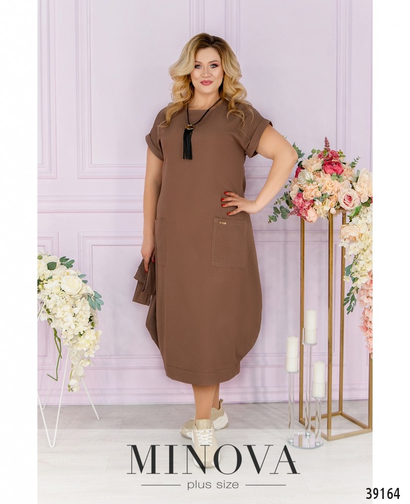 Стильное платье батал с подолом-баллоном, по бокам - накладные карманы, рукава с небольшими отворотами, в комплекте пояс и подвеска, вырез горловины полукруглый, застёжек нет. Пояс/аксессуар входит в комплект.