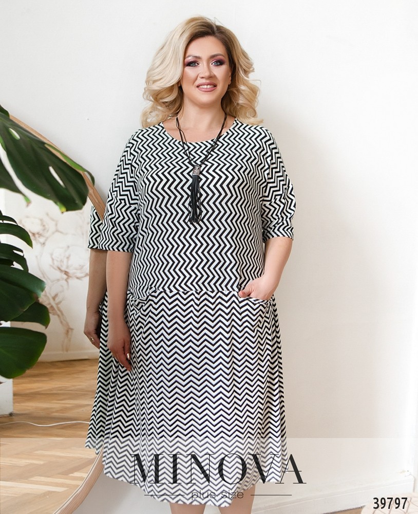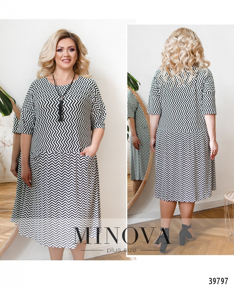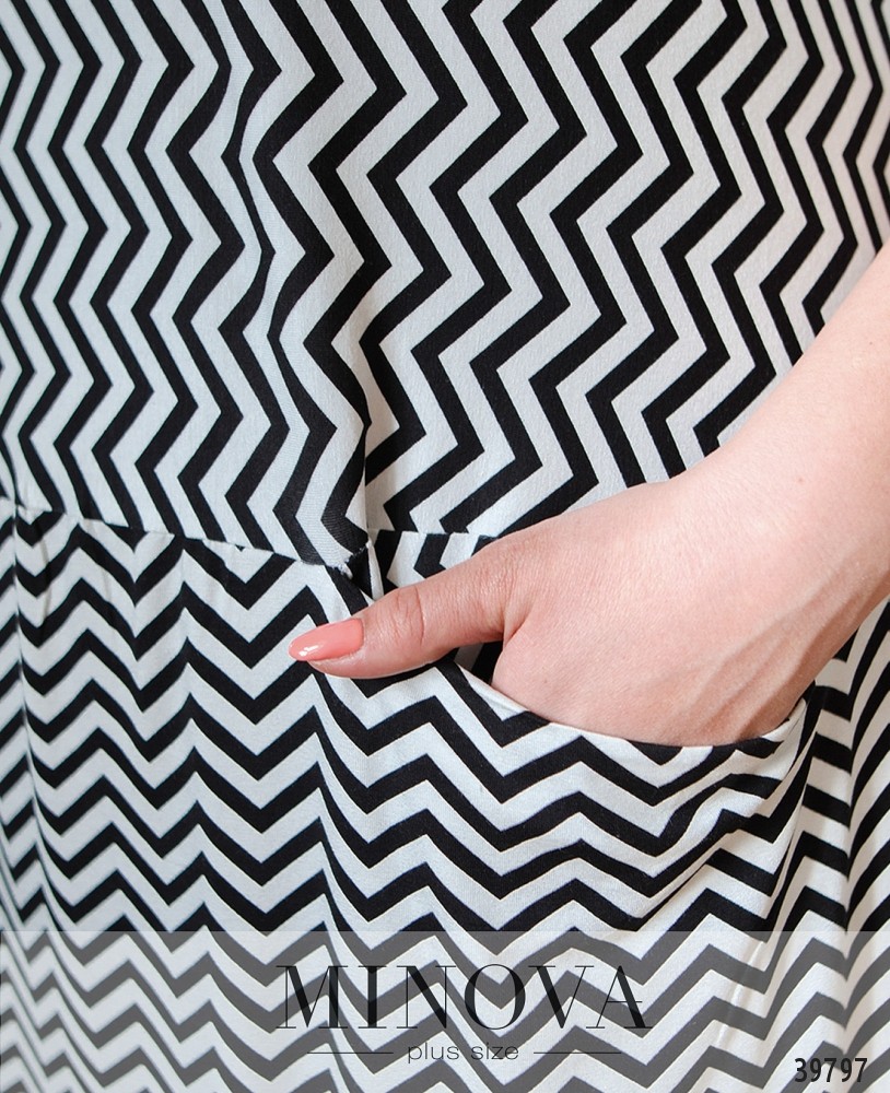 Привлекательное лёгкое платье батал с ярким принтом в зигзаг, рукава без манжет, на бёдрах спереди - накладные карманы. К подолу снизу подшиты оборки, вырез горловины "лодочка", застёжек нет. В комплекте - подвеска. Платье А-силуэта.