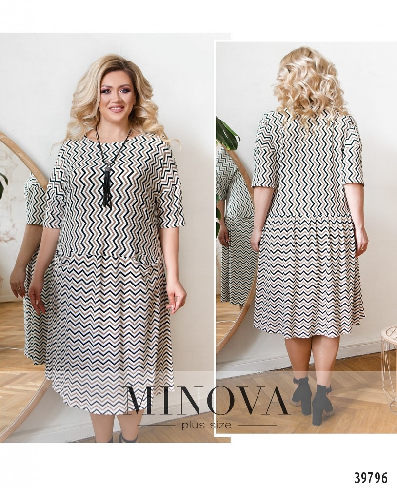 Привлекательное лёгкое платье батал с ярким принтом в зигзаг, рукава без манжет, на бёдрах спереди - накладные карманы. К подолу снизу подшиты оборки, вырез горловины "лодочка", застёжек нет. В комплекте - подвеска. Платье А-силуэта.