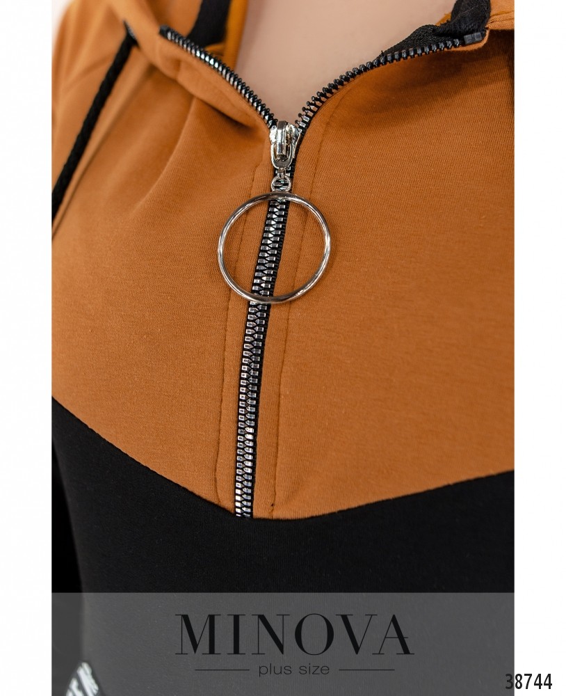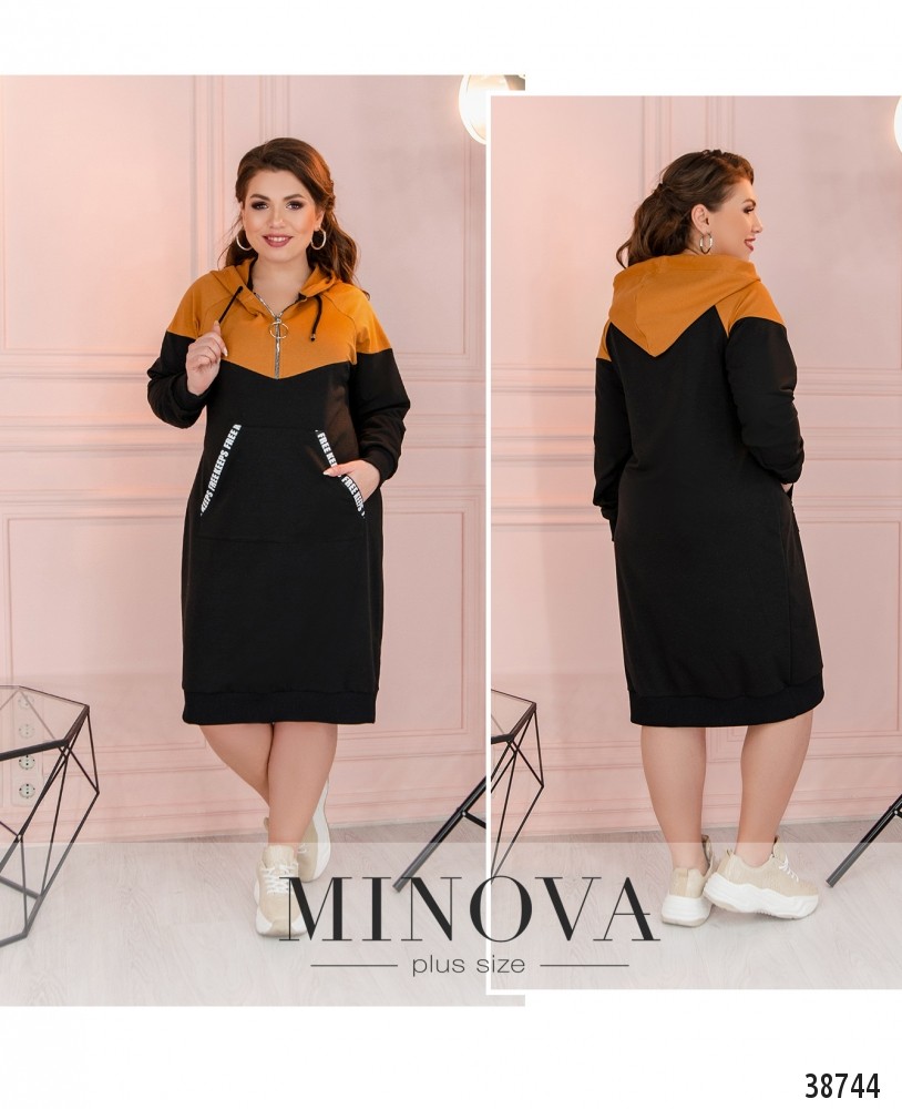 Привлекательное повседневное платье большого размера с манжетом по низу и манжетами на рукавах из трикотажа-рибаны. Платье с капюшоном, через капюшон пропущен шнурок, по центру на талии - сквозной карман с декоративными лентами, застёжка - молния от капюшона до середины груди.