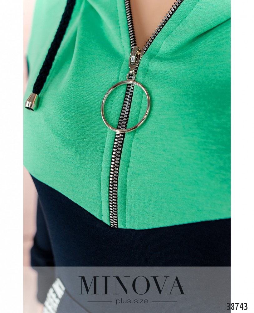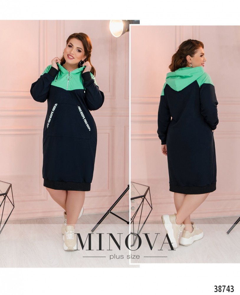 Привлекательное повседневное платье большого размера с манжетом по низу и манжетами на рукавах из трикотажа-рибаны. Платье с капюшоном, через капюшон пропущен шнурок, по центру на талии - сквозной карман с декоративными лентами, застёжка - молния от капюшона до середины груди.