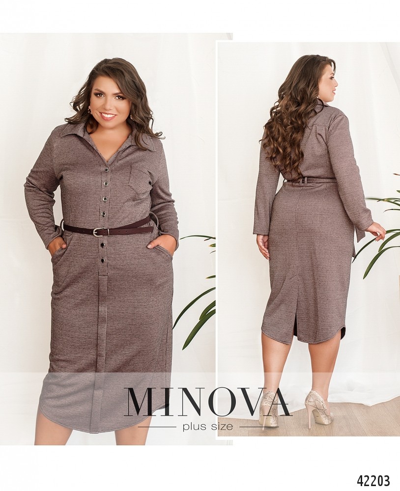 Повседневное платье батал с отложным воротничком и рядом пуговиц спереди на планке, от воротничка до талии. На груди - накладной кармашек слева, а справа вытачка. Рукава без манжет. В комплекте пояс, для него шлейки по бокам и две на спинке.