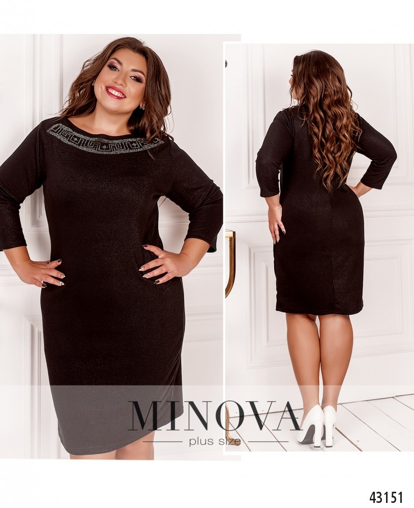 Элегантное минималистичное платье батал с узором из страз на горловине спереди. Вырез горловины "лодочка". Застёжек и карманов нет. Ткань декорирована люрексом. Рукава без манжет.