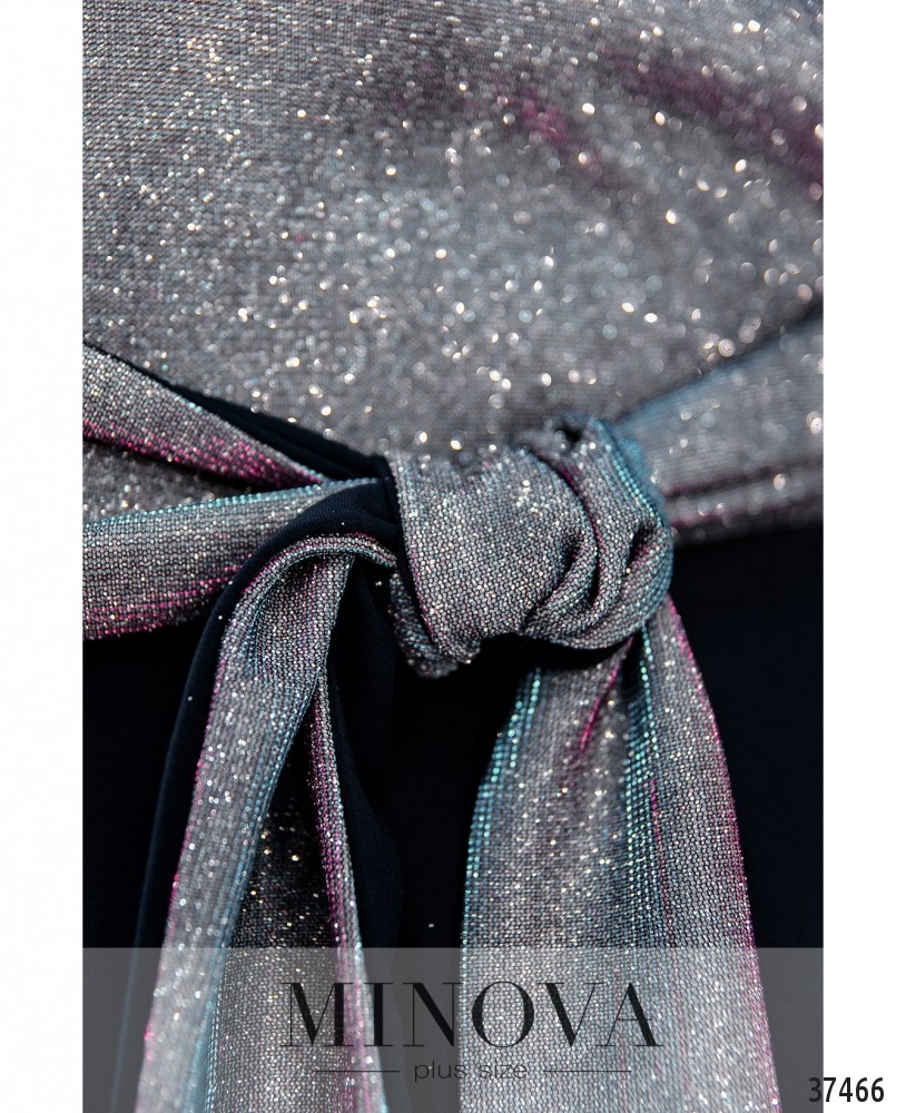 Элегантное вечернее платье батал с лифом на запАх, украшенным люрексом, глубоким декольте и длинным подолом. Карманов на платье нет. Рукава без манжет.