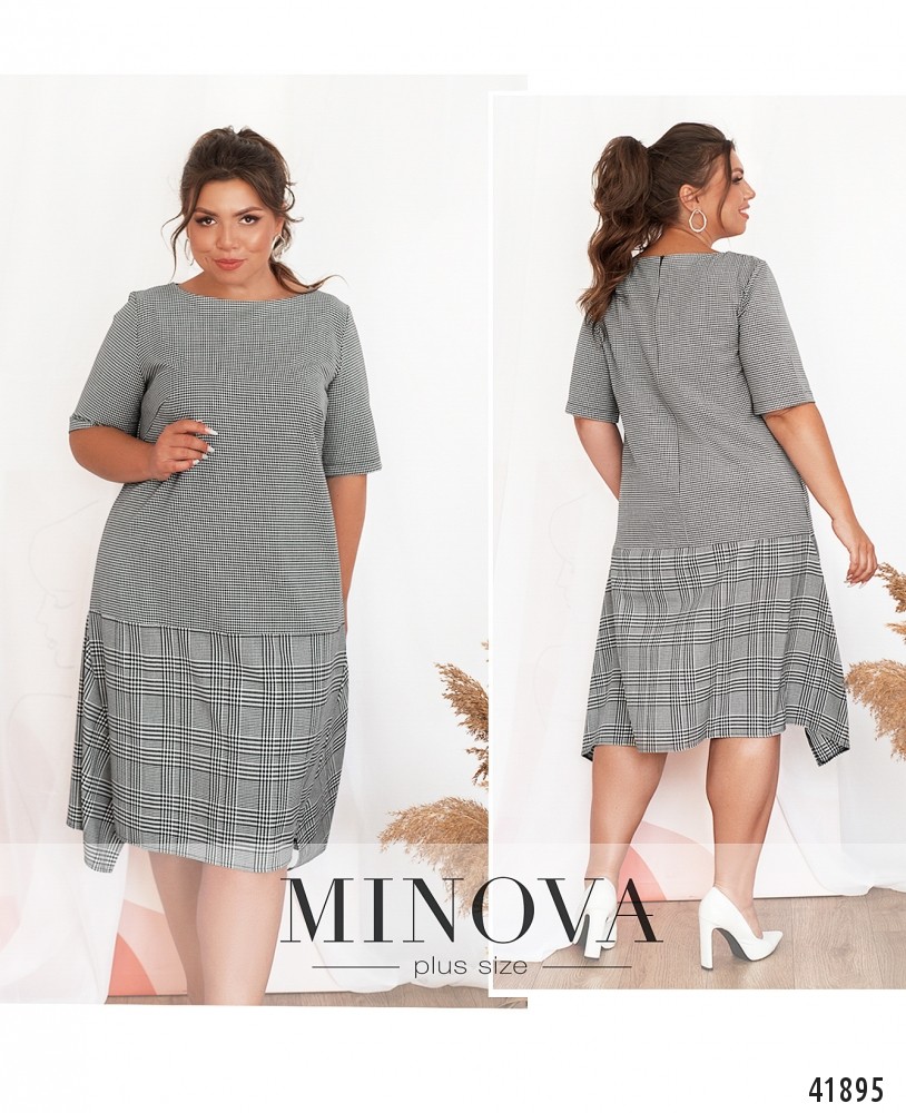 Повседневное платье батал в клеточку, рукава свободные, без манжет. Подол с подшитой нижней частью. На груди вытачки. Карманов нет, застёжка - вшитая по спинке молния. Платье прямого силуэта,отрезное по линии бедра, с ассиметричным подолом