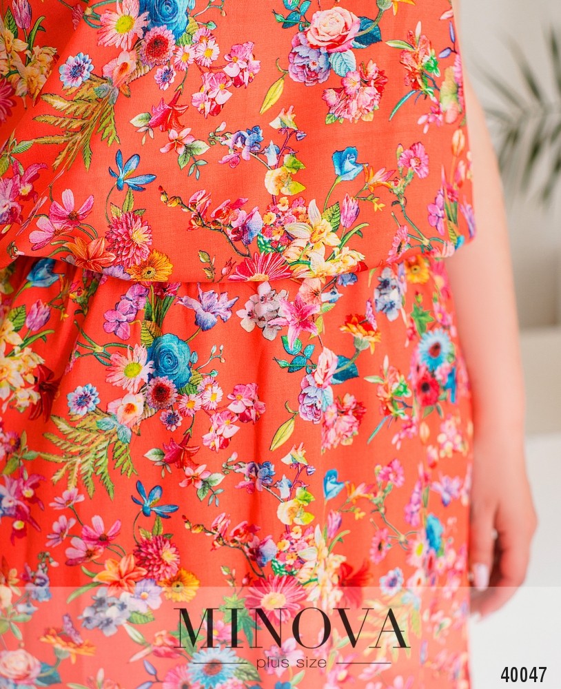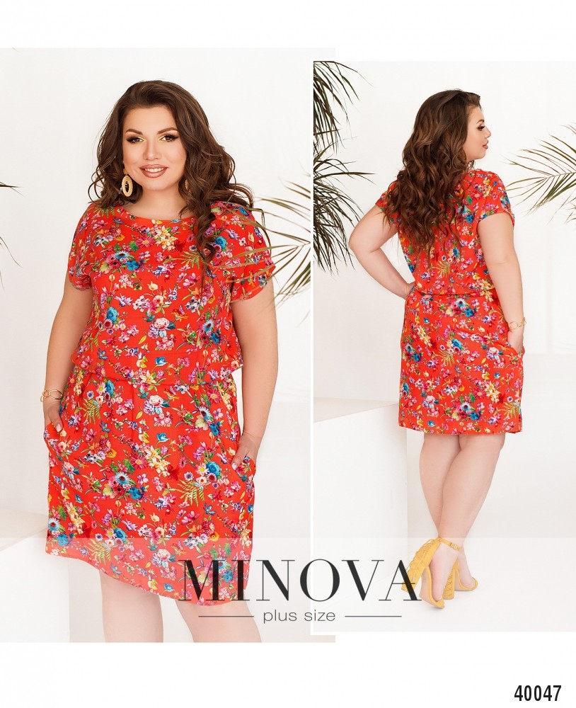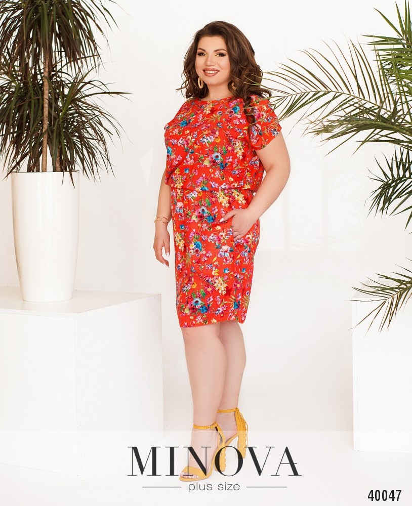 Яркое и привлекательное платье батал со вшитой в талию резинкой, рукава фасона "летучая мышь", застёжек нет, по бокам - врезные карманы, вырез горловины неширокий, полукруглый.