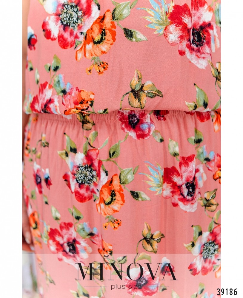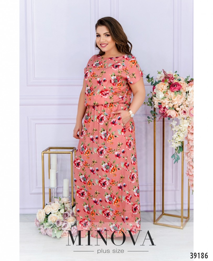Стильное лёгкое платье батал со вшитой в пояс резинкой, подол расклешён, верх свободный. Вырез горловины "лодочка", рукав - "летучая мышь". По бокам - врезные карманы. Застёжек нет. В боковых швах снизу разрезы.
