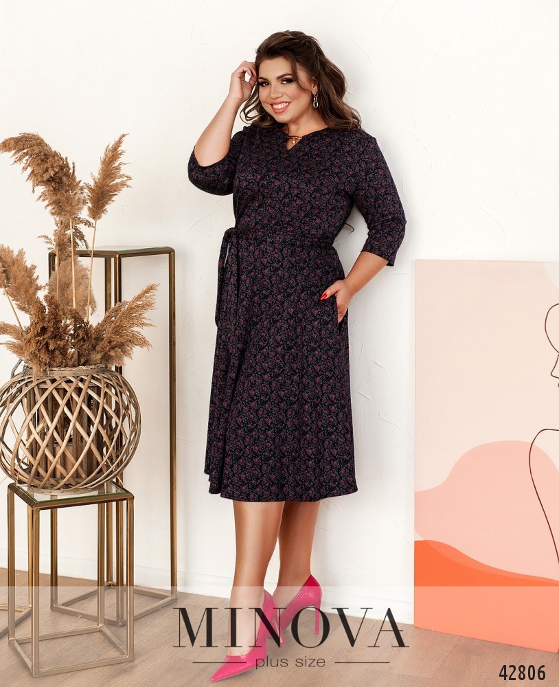 Романтичное платье батал с цветочным принтом, подол подшит к верху и от талии расклешён, что придаёт платью А-силуэт. На фигурном вырезе горловины - металлический декор. Рукава без манжет. Застёгивается на молнию, вшитую по спинке. В комплекте пояс. По бокам - врезные карманы. Ткань изнутри гладкая.