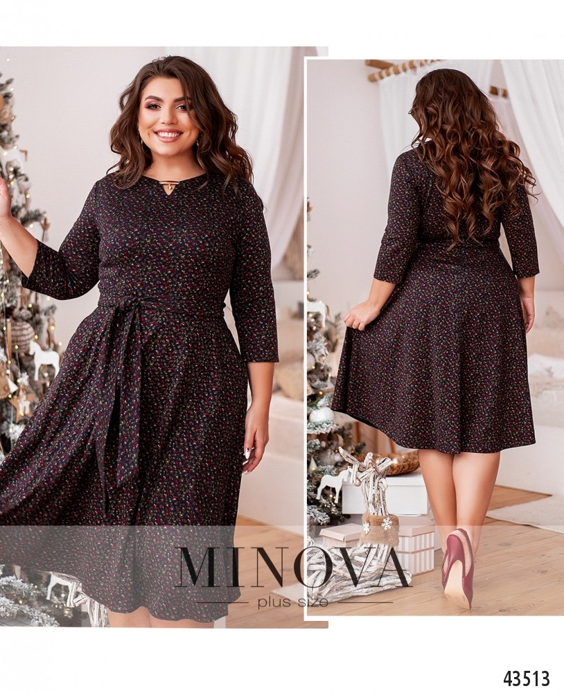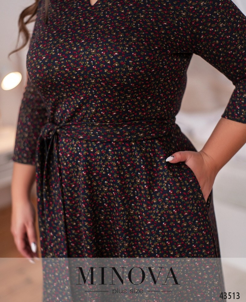 Стильное платье плюс сайз с декором и вырезом на груди, рукава без манжет. По бокам - врезные карманы, застёжка - вшитая по спинке молния. В комплекте пояс в тон.