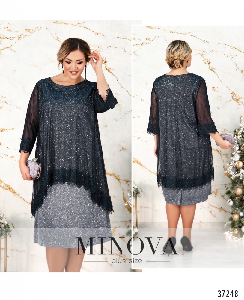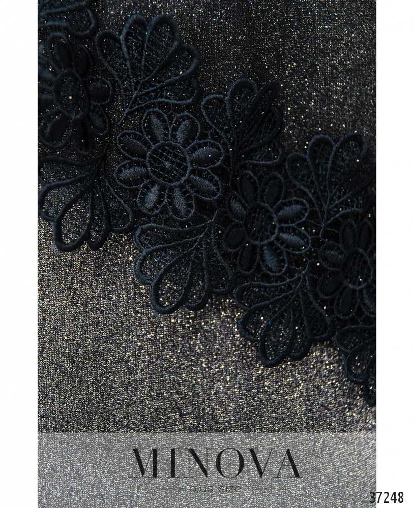 Нарядное вечернее платье батал из мягкой ткани с люрексом, сверху подшита полупрозрачная накидка с кружевом по подолу и на рукавах. Рукава без подкладки. Снизу под блестящей тканью подшита мягкая подкладка. На груди вытачки. Вырез горловины широкий, неглубокий, полукруглый. Без застёжек и карманов.