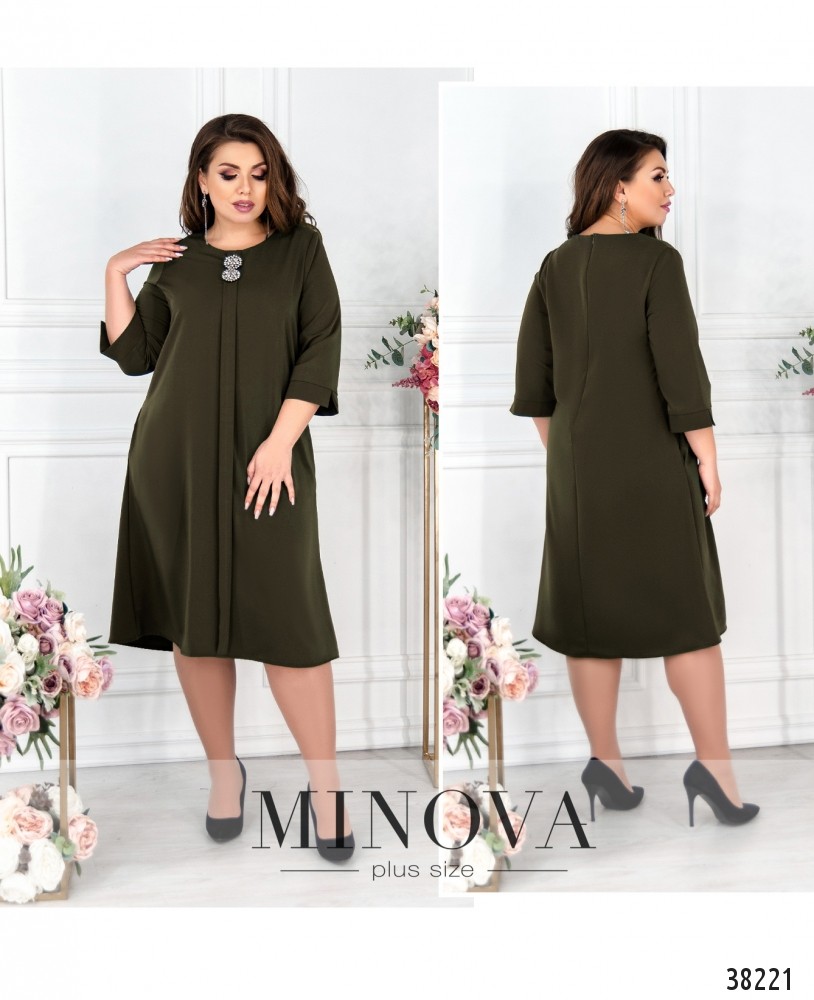 Строгое и нарядное платье свободного кроя. Вырез горловины полукруглый, под вырезом – две нежных пришитых броши на декоративной планке, которая расположена от горловины до подола. По бокам – врезные карманы, застёгивается на вшитую по спинке молнию, рукава с мягкими манжетами, на манжетах небольшие разрезы.