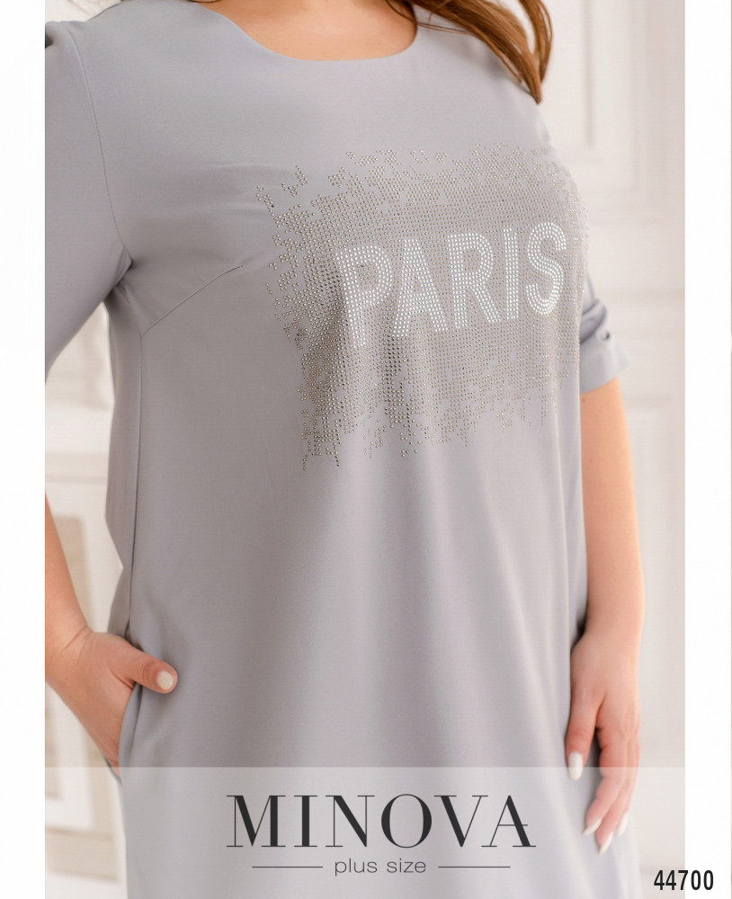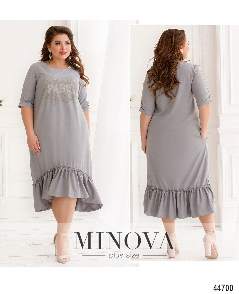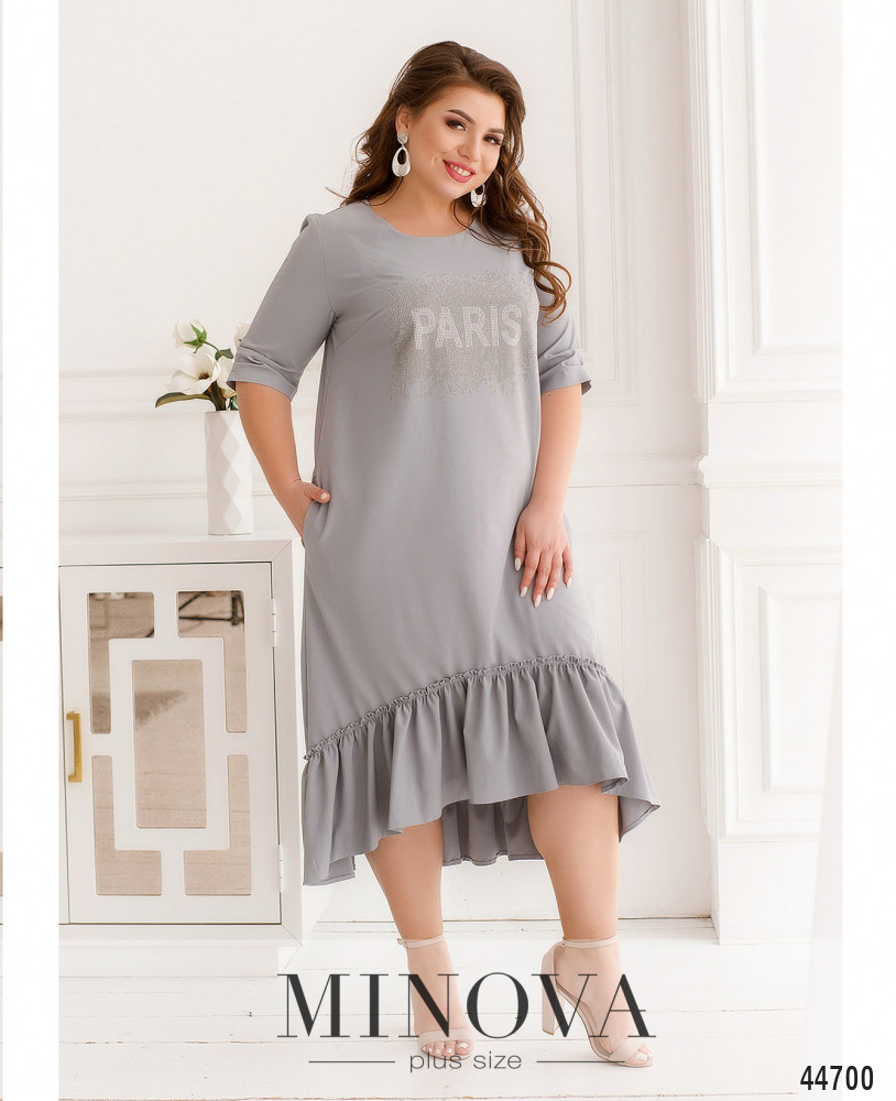 Изящное платье батал с декором на груди из страз, украшено по подолу мягкими оборками. Рукава немного присобраны на уровне манжет, на груди вытачки, по бокам - карманы в шве. Застёжек нет, вырез горловины - полукруглый.