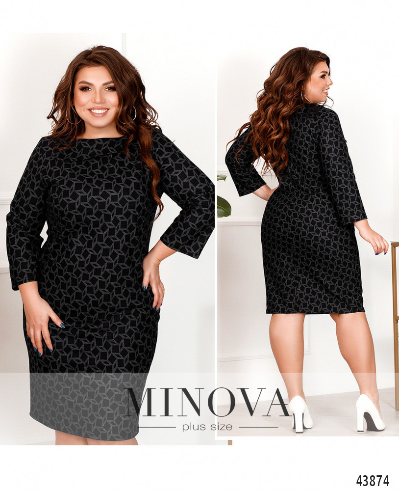 Элегантное платье батал с отложным асимметричным воротничком, рукава без манжет, на груди вытачки. Застёжек и карманов нет.