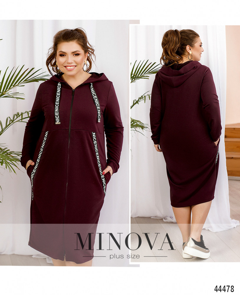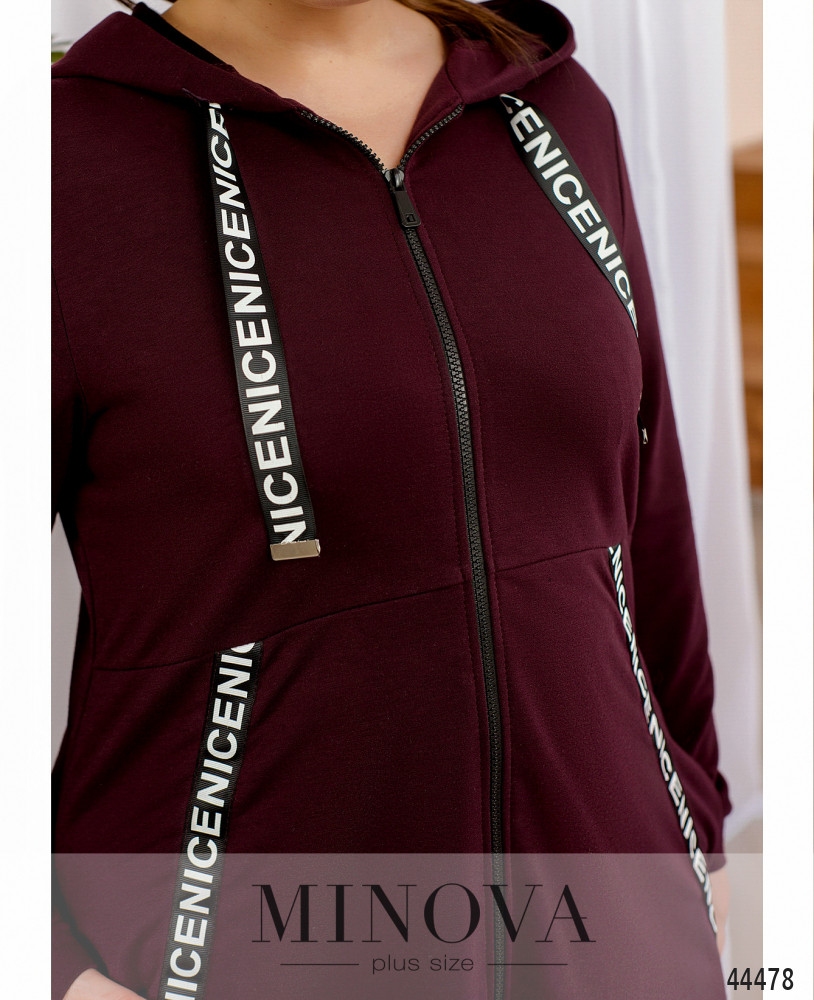 Стильное и удобное платье батал с яркими лентами, пропущенными через капюшон и украшающими платье по диагонали. Ленты на капюшоне с металлическими наконечниками. По бокам - карманы в шве, подкладки нет, рукава с мягкими манжетами. Застёжка - сквозная молния во всю длину.