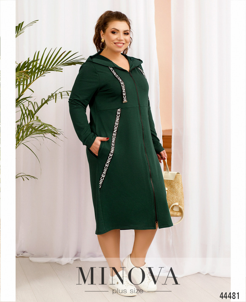 Стильное и удобное платье батал с яркими лентами, пропущенными через капюшон и украшающими платье по диагонали. Ленты на капюшоне с металлическими наконечниками. По бокам - карманы в шве, подкладки нет, рукава с мягкими манжетами. Застёжка - сквозная молния во всю длину.