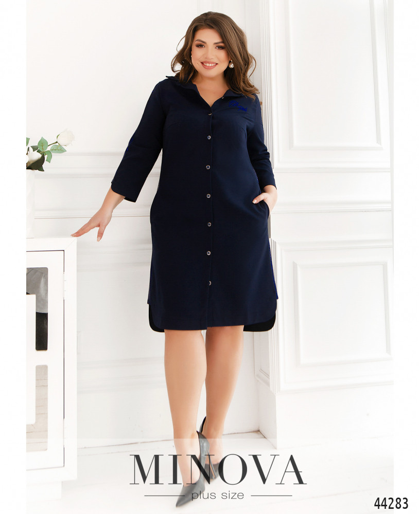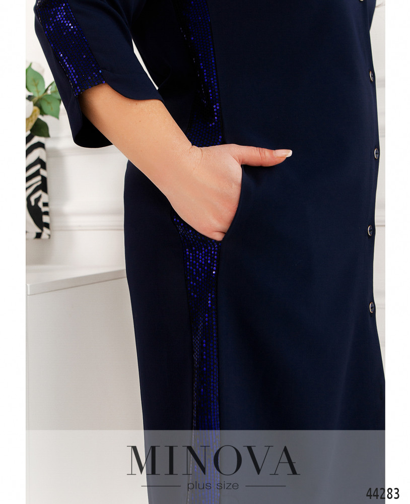 Привлекательное платье батал с лампасами из пайеток на рукавах и по бокам. Воротничок отложной, застёжка - ряд пуговиц спереди на планке. На груди вытачки, на левой стороне - декор из страз. По бокам - карманы в шве. На подоле небольшие разрезы сбоку. На спине - продольные вытачки.