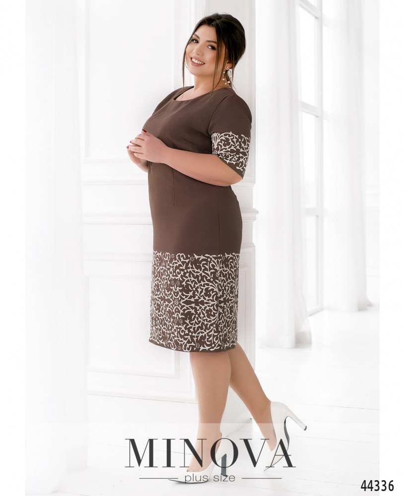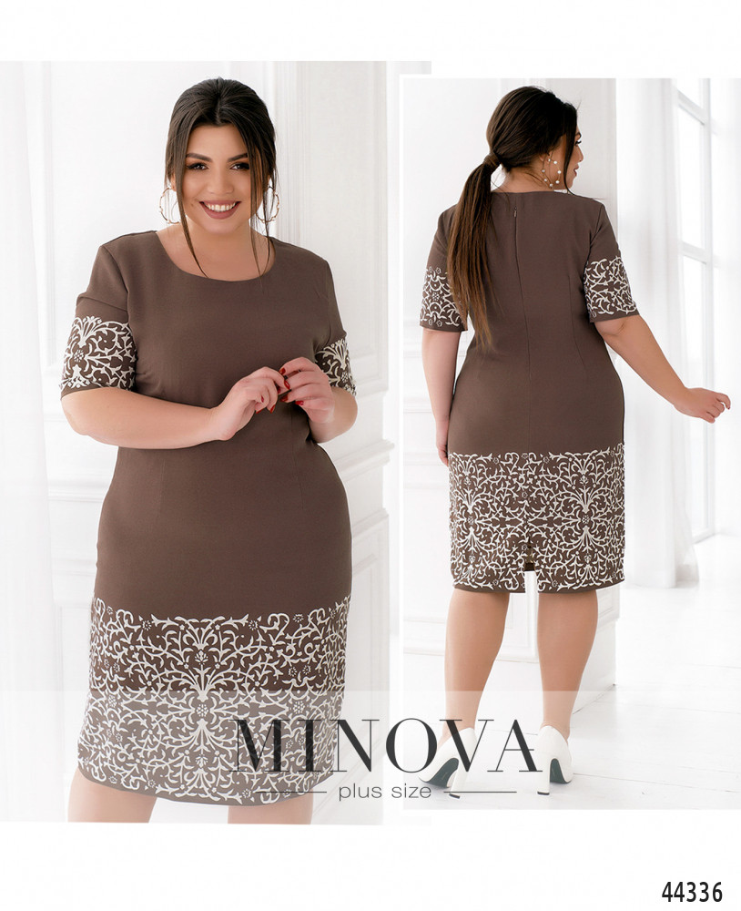 Элегантное и нарядное платье батал с узором на свободных рукавах и на подоле с двух сторон. Вырез горловины полукруглый, на груди диагональные вытачки, на спине и на талии спереди - продольные вытачки. На подоле сзади шлица, застёжка - вшитая по спинке чуть ниже уровня горловины потайная молния. Карманов нет.