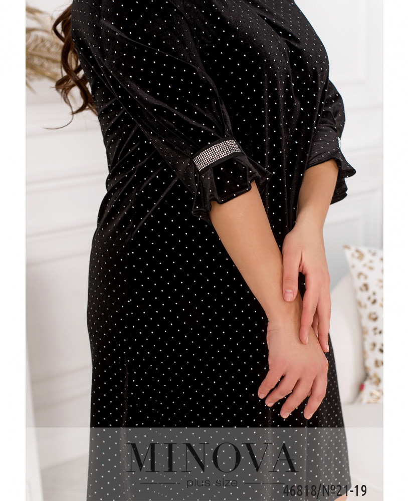 Стильно и роскошно выглядит вечернее платье, создающее целостный и гармоничный женский образ. Эта модель привлекает внимание благодаря лаконичному свободному крою и мягкой бархатной ткани с мерцающими вкраплениями. Изюминкой этого платья безусловно являются рукава 3/4, стянутые внизу и украшенные декоративными стразами.