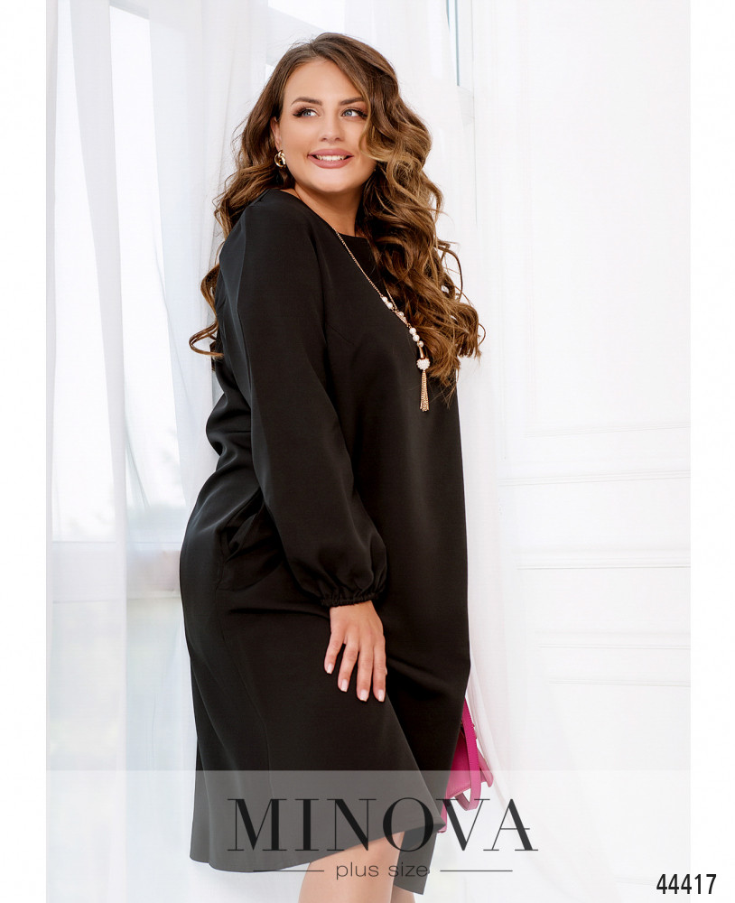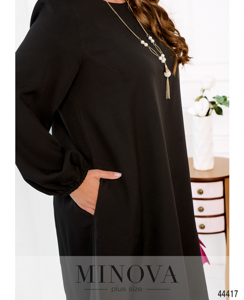 Элегантное и минималистичное платье с полукруглым широким вырезом горловины. По бокам - карманы в шве. Рукав свободный, на запястье присобран резинкой, без манжета. Застёжек нет. На груди диагональные вытачки. Украшение входит в комплект.