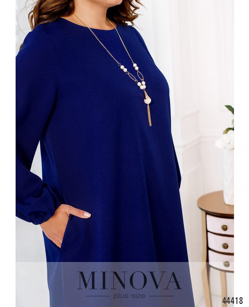 Элегантное и минималистичное платье с полукруглым широким вырезом горловины. По бокам - карманы в шве. Рукав свободный, на запястье присобран резинкой, без манжета. Застёжек нет. На груди диагональные вытачки. Украшение входит в комплект.