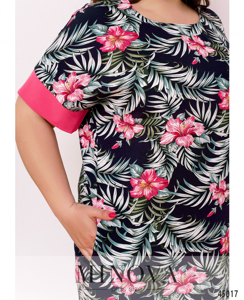 Яркое и нарядное платье батал с полукруглым вырезом горловины, по бокам подола - длинные разрезы. Рукава с контрастными манжетами. По бокам - карманы в шве. Застёжек нет.