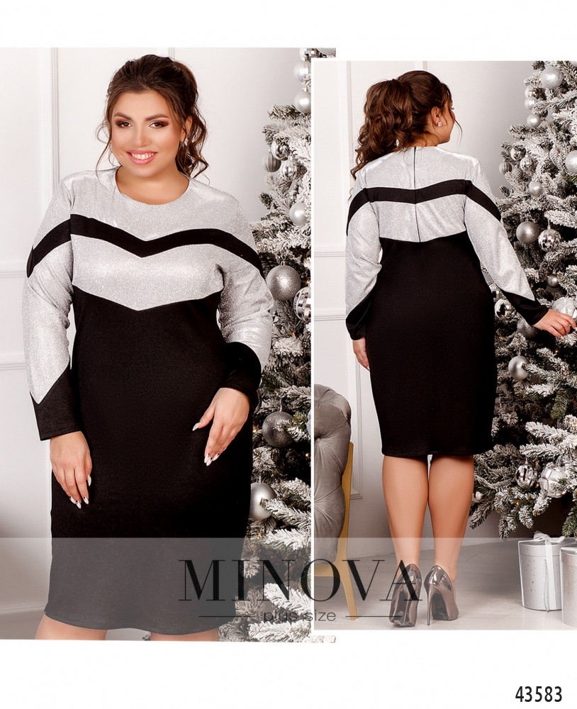 Нарядное платье с люрексом на лифе, рукава без манжет, карманов нет. Вырез горловины полукруглый, неглубокий. Застёжка - молния, вшитая по спинке.