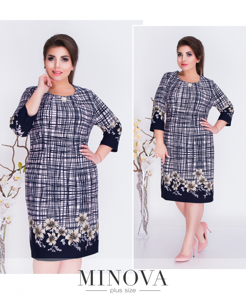 Приталенное платье с брошкой на круглом вырезе, рукавами ¾ длиной до колена. Сзади есть небольшой разрез для удобства при ходьбе.