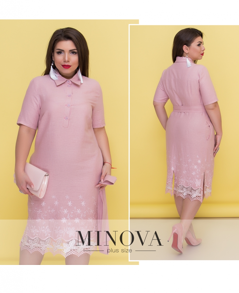 Летнее льняное платье-рубашка прямого кроя с поясом, короткими рукавами и вышитым подолом. На груди платье застегивается на пуговицы. Подол платья дополнен карманами и двумя боковыми разрезами. На спине есть выточки и разрез по линии шага.