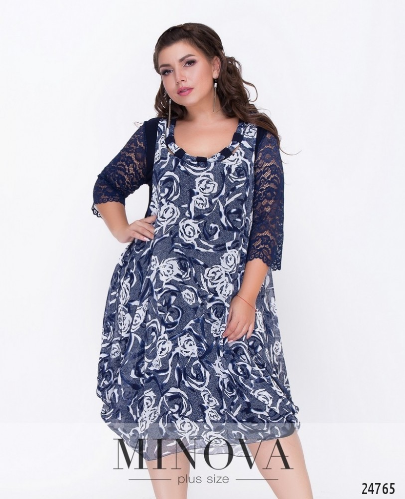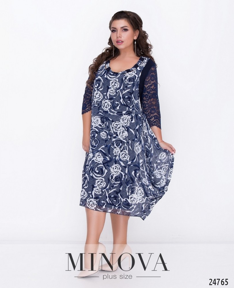 Воздушное двухслойное платье с элегантными кружевными рукавами ¾ . Нижний подклад выполнен с однотонной ткани, верхняя часть - легкая шифоновая ткань. Вырез декорирован. Платье без дополнительных застежек.