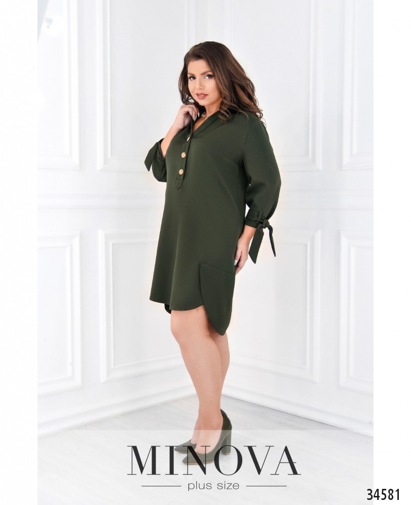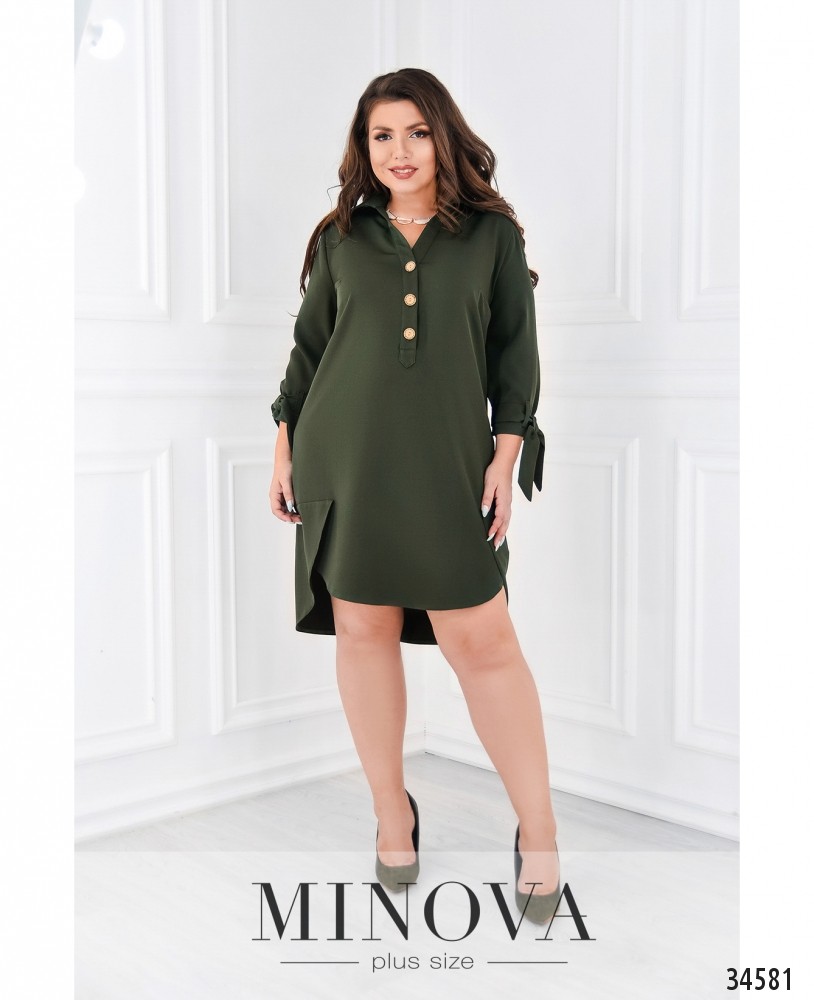 Оригинальный крой – залог создания привлекательного наряда! В представленной в новом каталоге Minova модели платья батал сразу несколько интересных элементов. Во-первых, необычный подол, подшитый по бокам на запАх в виде небольших накладок. По спине чуть длиннее, спереди – короче. Платье А-силуэта, напоминает длинную рубашку благодаря отложному воротничку и ряду симпатичных круглых пуговиц, от воротника до груди. На груди – поперечные вытачки. Рукава длиной ¾, на манжетах пропущен поясок, как на тренчкоте, его можно завязать бантом. Карманов нет. Ткань очень лёгкая. Можно выбрать тёмные или пастельные оттенки, и разнообразить свой look необычными аксессуарами.