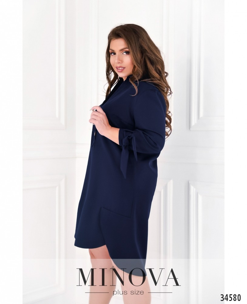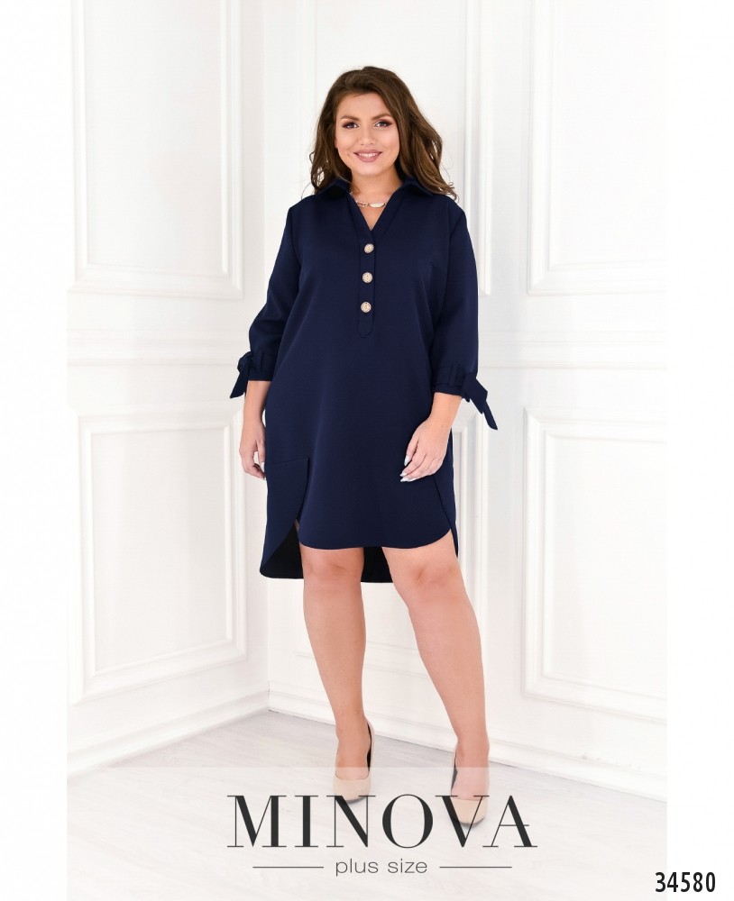 Оригинальный крой – залог создания привлекательного наряда! В представленной в новом каталоге Minova модели платья батал сразу несколько интересных элементов. Во-первых, необычный подол, подшитый по бокам на запАх в виде небольших накладок. По спине чуть длиннее, спереди – короче. Платье А-силуэта, напоминает длинную рубашку благодаря отложному воротничку и ряду симпатичных круглых пуговиц, от воротника до груди. На груди – поперечные вытачки. Рукава длиной ¾, на манжетах пропущен поясок, как на тренчкоте, его можно завязать бантом. Карманов нет. Ткань очень лёгкая. Можно выбрать тёмные или пастельные оттенки, и разнообразить свой look необычными аксессуарами.