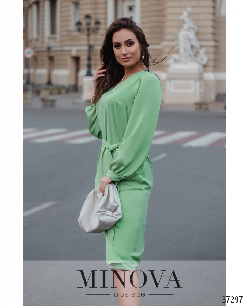 Минималистичное повседневное платье батал из лёгкой ткани. Крой свободный, в комплекте пояс. Рукава с мягкими манжетами, манжеты с одной пуговицей. Карманы и застёжки отсутствуют. Вырез декольте V-образный. Пояс/аксессуар входит в комплект.