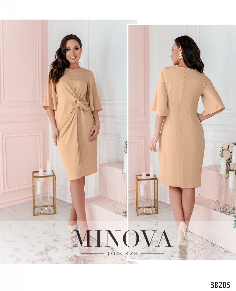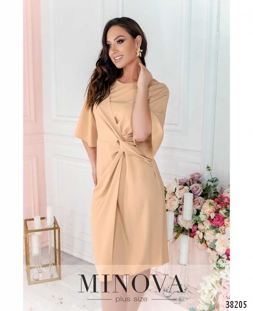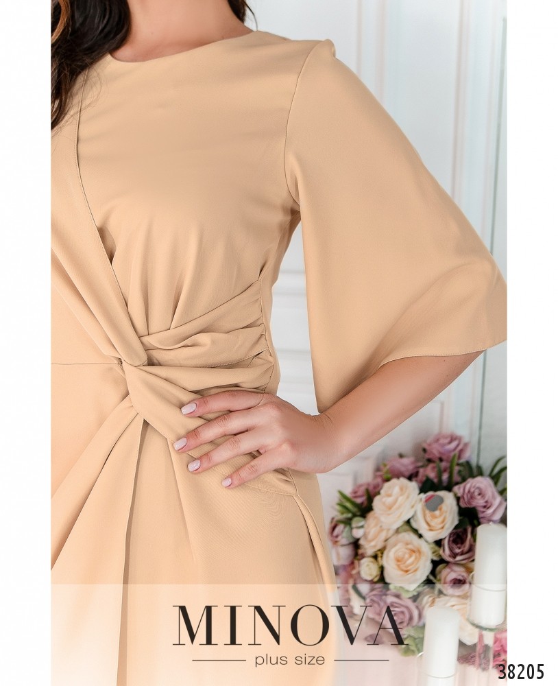 Оригинальное приталенное платье плюс сайз, подол слева присобран и «захвачен» широкой подшитой лентой, правая часть запахнута и подшита изнутри. Карманов нет. Рукава широкие, без манжет. Застёгивается на вшитую по спинке молнию. Вырез горловины полукруглый.