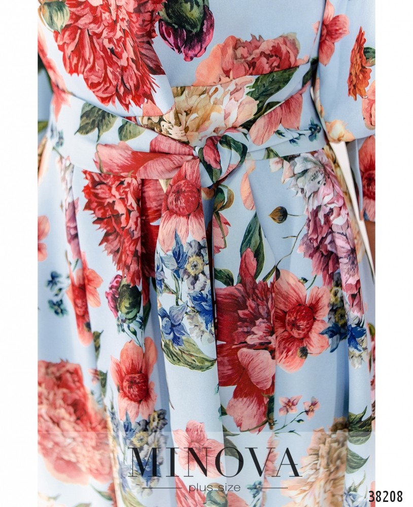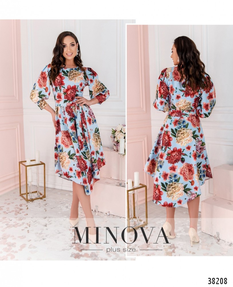 Яркое элегантное платье батал с асимметричным, скруглённым по бокам подолом. А-силуэт, карманов нет, в комплекте пояс. Застёгивается на потайную молнию, вшитую слева. Вырез горловины полукруглый. Подол подшит к верху и расклешён, с декоративными складками на талии. На груди вытачки. Рукава с мягкими манжетами без пуговиц.