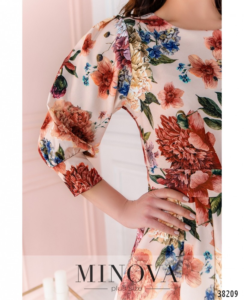 Яркое элегантное платье батал с асимметричным, скруглённым по бокам подолом. А-силуэт, карманов нет, в комплекте пояс. Застёгивается на потайную молнию, вшитую слева. Вырез горловины полукруглый. Подол подшит к верху и расклешён, с декоративными складками на талии. На груди вытачки. Рукава с мягкими манжетами без пуговиц.