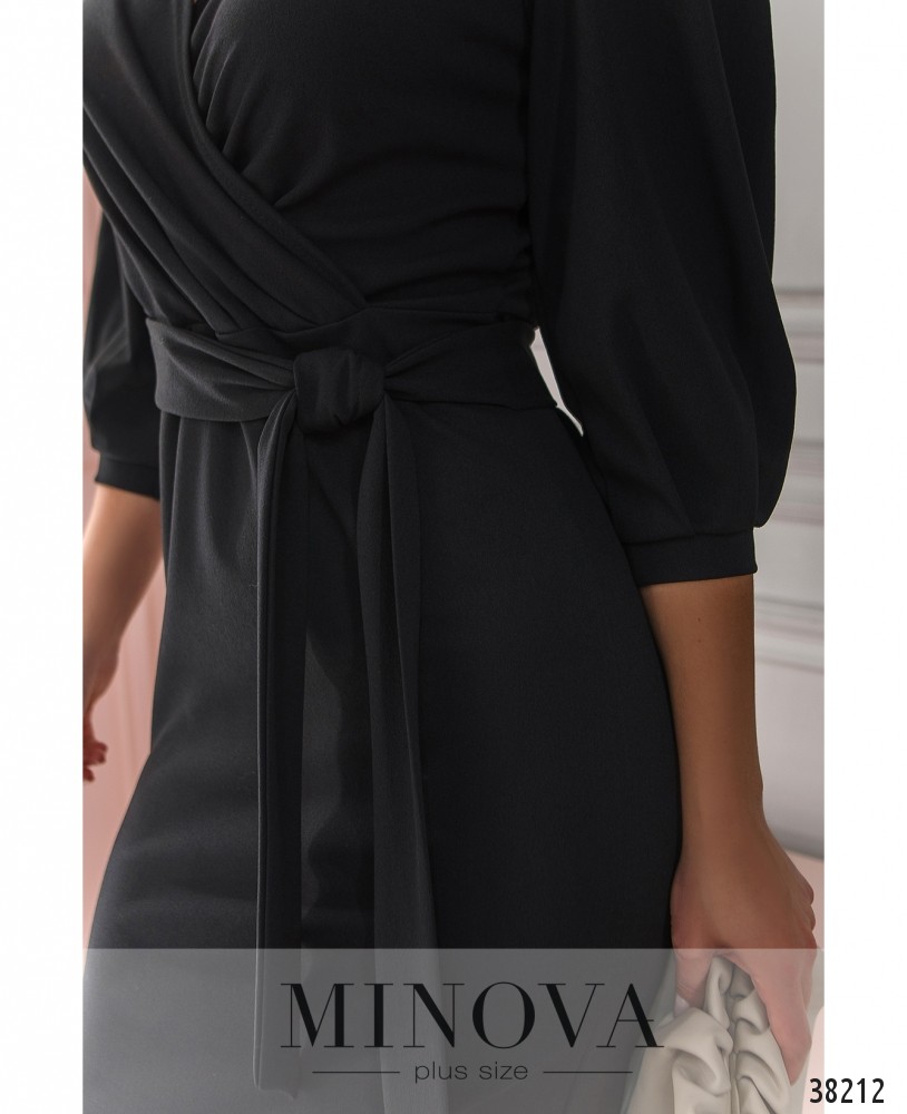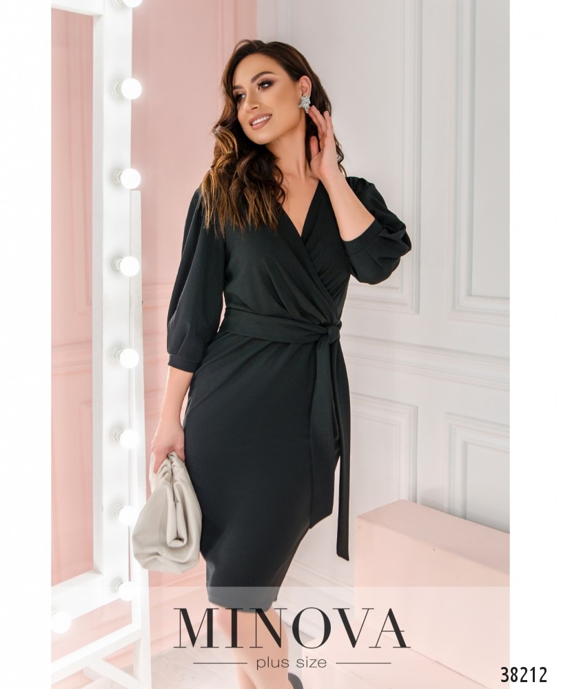 Минималистичное приталенное платье батал с лифом на запАх, в комплекте пояс, карманов нет. Рукава с мягкими манжетами без пуговиц. В комплекте пояс. Застёжек нет.