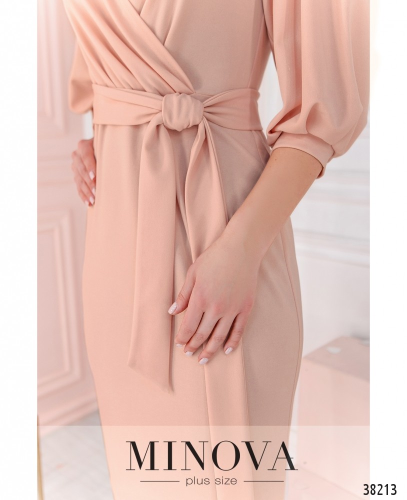 Минималистичное приталенное платье батал с лифом на запАх, в комплекте пояс, карманов нет. Рукава с мягкими манжетами без пуговиц. В комплекте пояс. Застёжек нет.