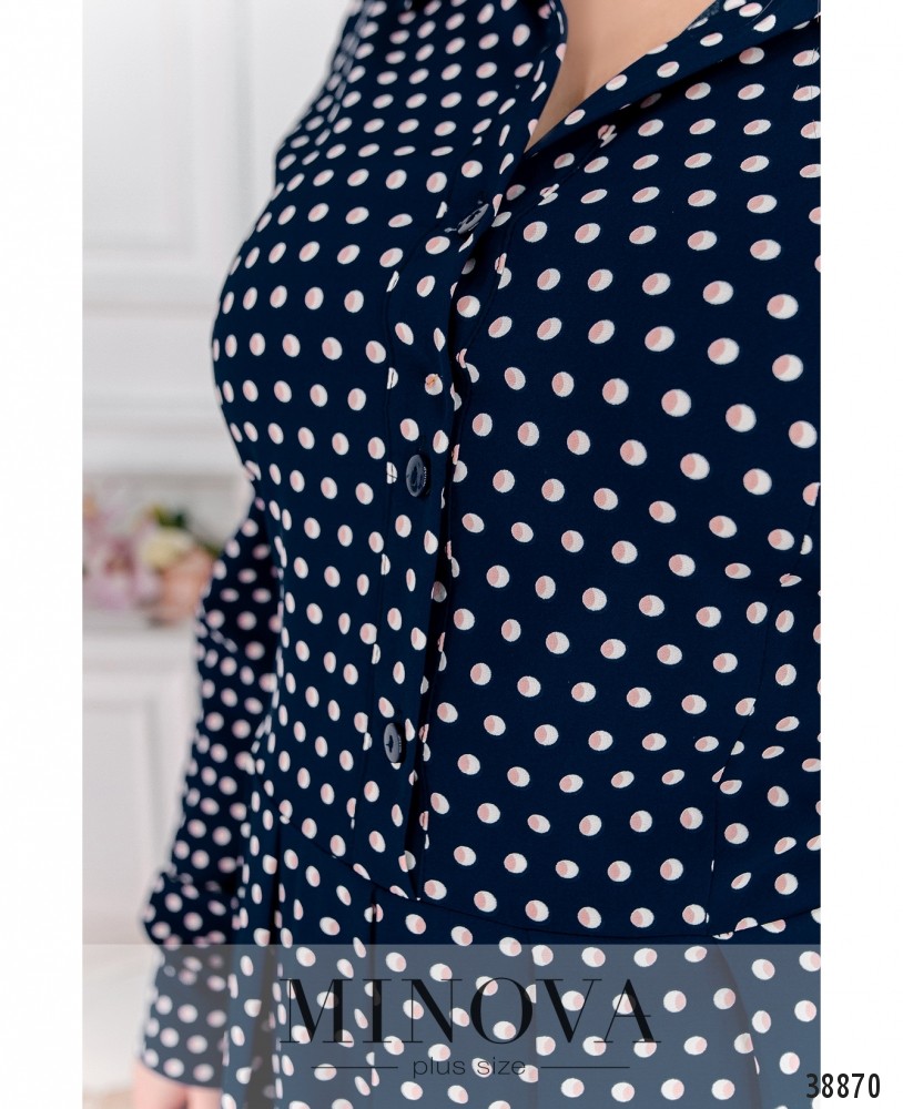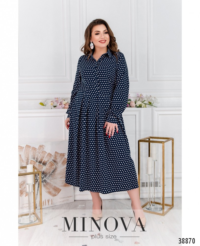 Элегантное повседневное платье большого размера с подшитым к лифу и расклешённым подолом. Верх - в "рубашечном" стиле, с рядом пуговиц на планке и отложным воротничком. Рукава с манжетами, на манжетах по одной пуговице. Без карманов.