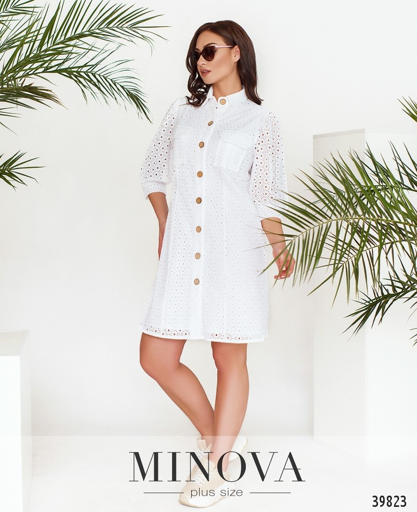 Ажурное платье батал с подшитым мягким нижним слоем. Рукава - удлинённые "фонарики" с манжетами, без пуговиц. Воротничок отложной, на груди - накладные карманы, застёгивается на ряд пуговиц спереди на планке.