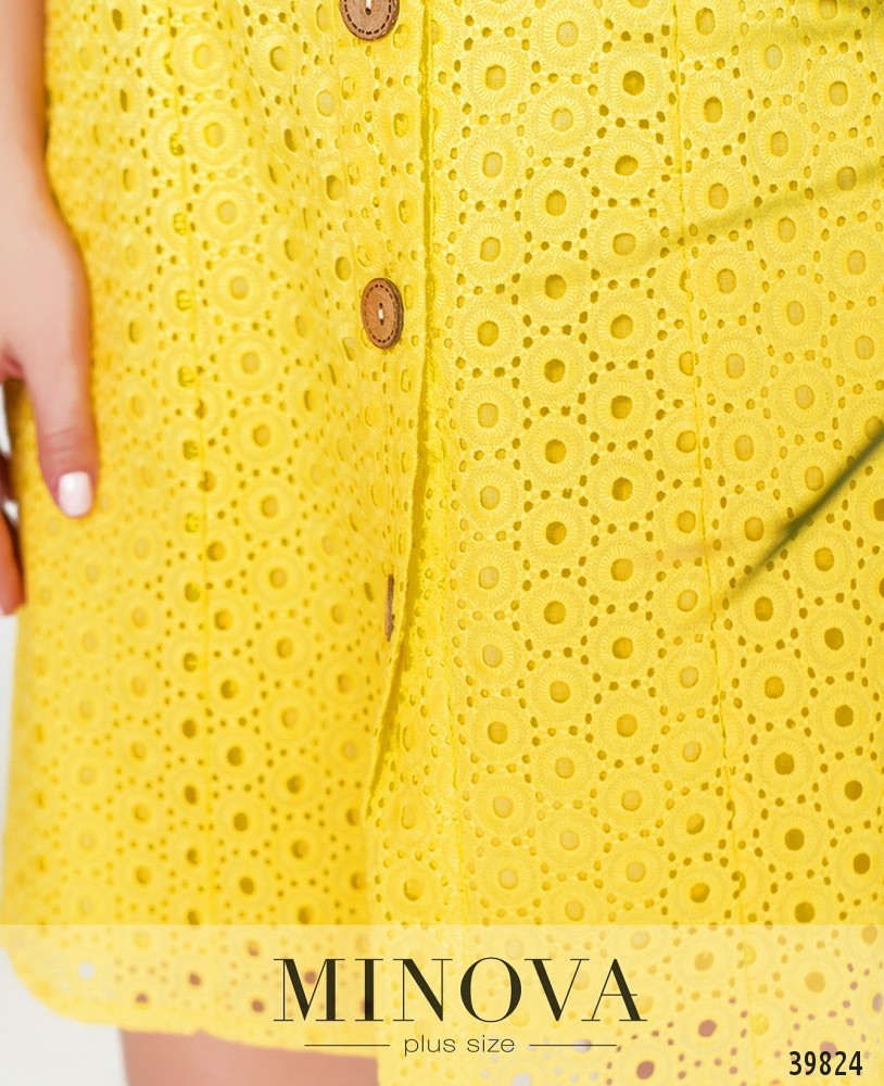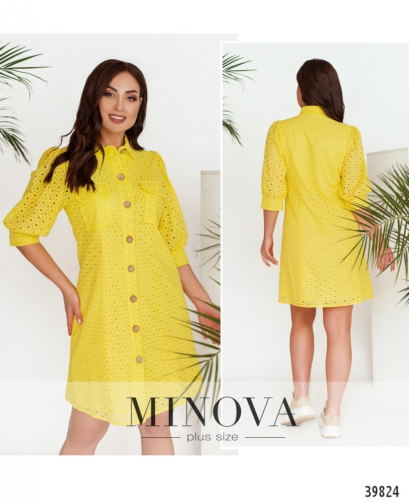 Ажурное платье батал с подшитым мягким нижним слоем. Рукава - удлинённые "фонарики" с манжетами, без пуговиц. Воротничок отложной, на груди - накладные карманы, застёгивается на ряд пуговиц спереди на планке.