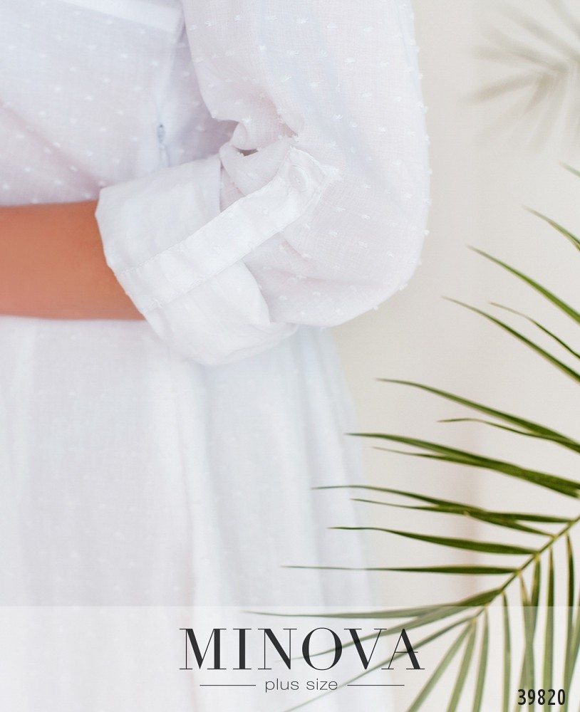 Привлекательное платье большого размера, лиф - в "рубашечном" стиле: отложной воротничок, рукава с манжетами, на манжетах по одной пуговице, ряд пуговиц спереди на планке, до подола. Подол подшит к лифу, расклешён, с мягким нижним слоем. На груди вытачки. Рукав функциональный: полная длина или подворачивается до уровня 3/4 и застегивается на патик с пуговицей. Платье застегивается сбоку на потайную молнию.