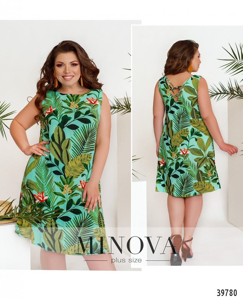 Яркое платье большого размера, без рукавов, без застёжек и карманов, на спинке - V-образный вырез с лентами крест-накрест. На груди вытачки. Ткань очень мягкая, приятная к телу.