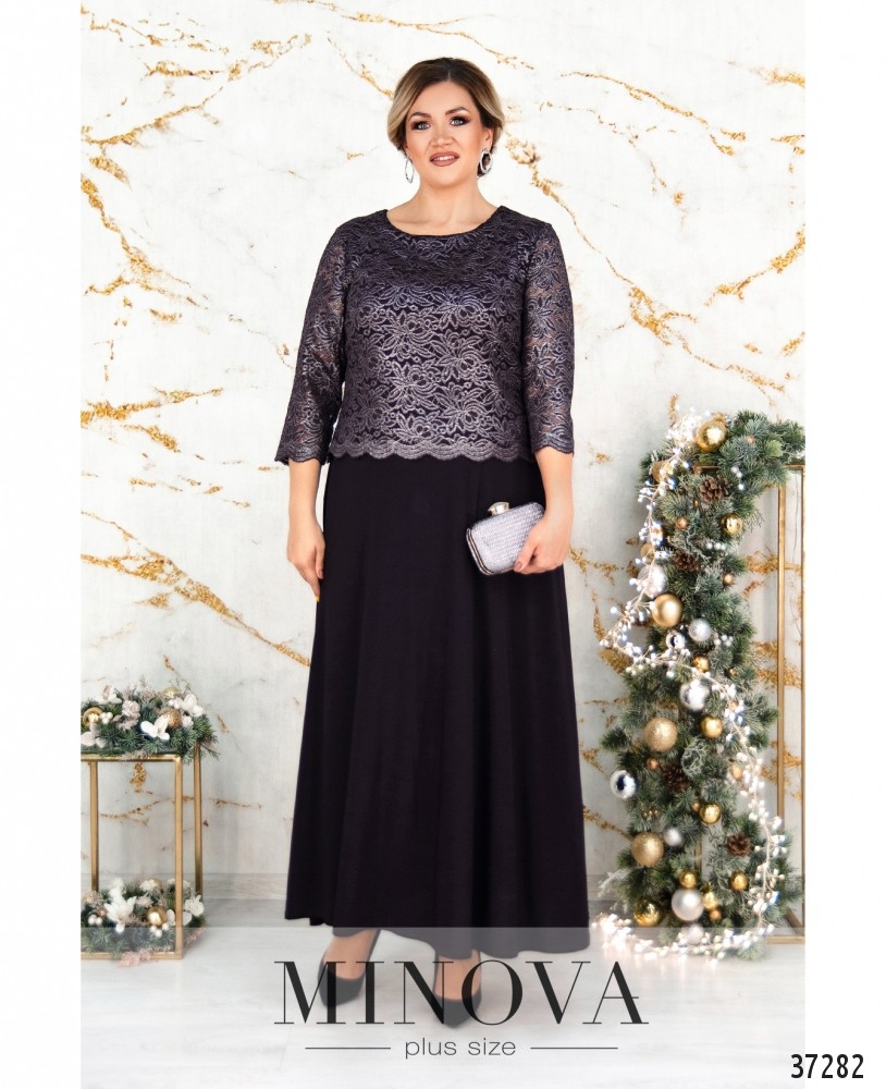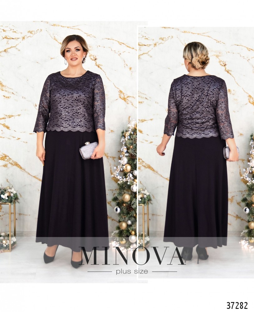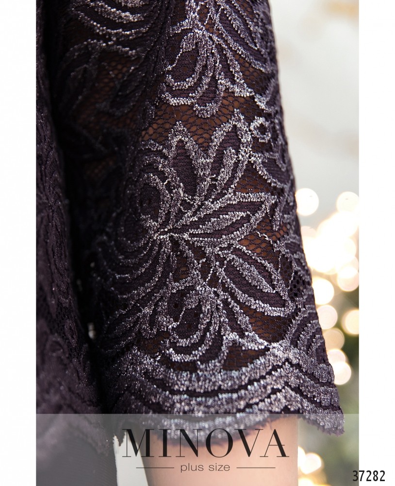 Вечернее платье батал А-силуэта из мягкой ткани с подшитой сверху кружевной накидкой. Рукава кружевные, без подкладки и манжет. Вырез горловины полукруглый. Подол расклешён. Карманов и застёжек нет. На груди вытачки.