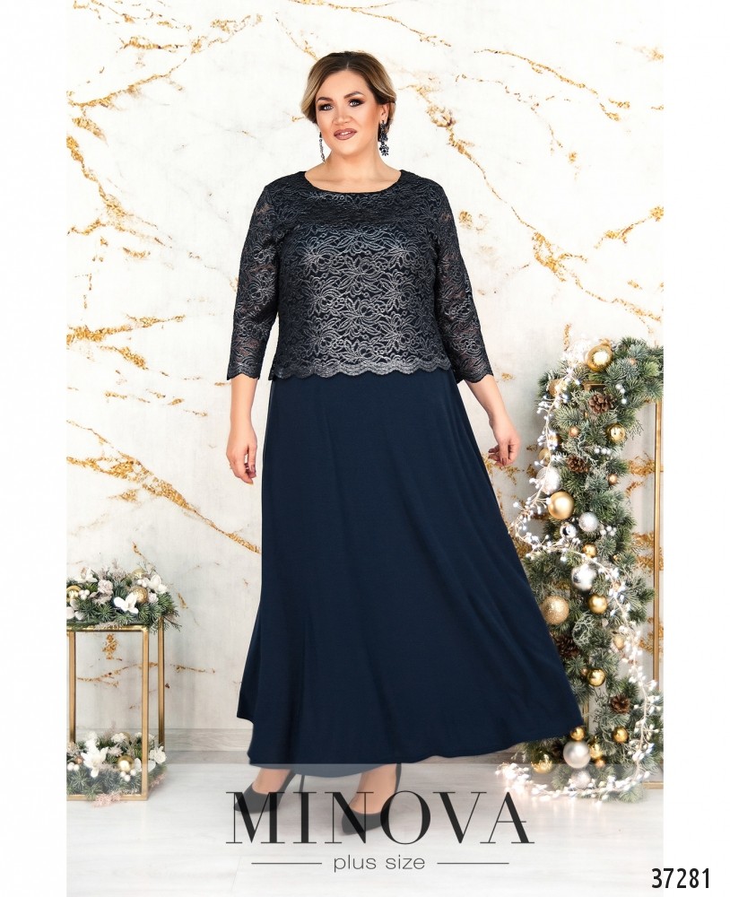Вечернее платье батал А-силуэта из мягкой ткани с подшитой сверху кружевной накидкой. Рукава кружевные, без подкладки и манжет. Вырез горловины полукруглый. Подол расклешён. Карманов и застёжек нет. На груди вытачки.