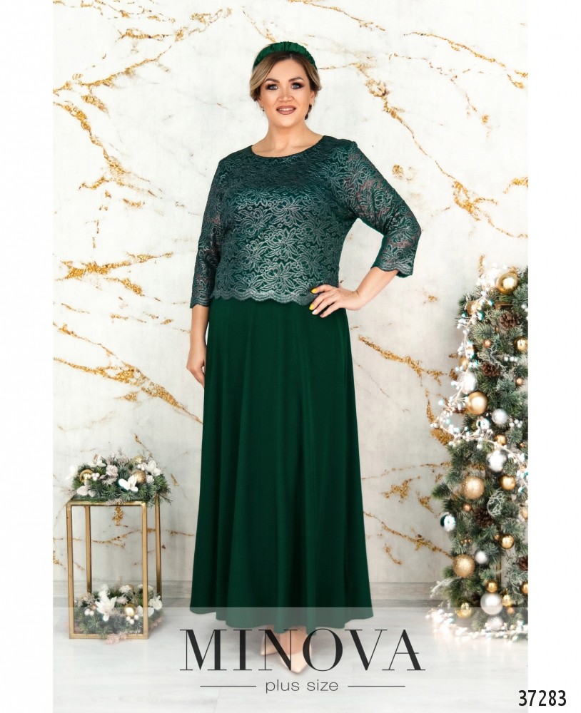 Вечернее платье батал А-силуэта из мягкой ткани с подшитой сверху кружевной накидкой. Рукава кружевные, без подкладки и манжет. Вырез горловины полукруглый. Подол расклешён. Карманов и застёжек нет. На груди вытачки.