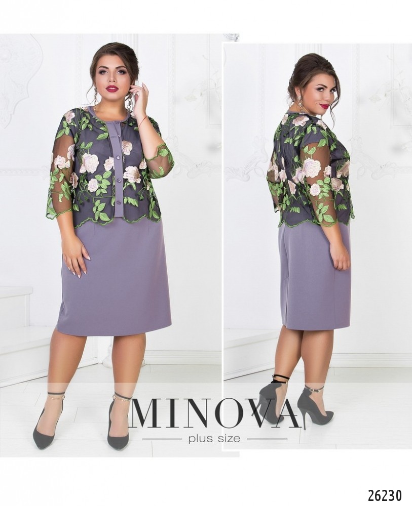Элегантный костюм-двойка состоит из однотонного платья и болеро из сетки с вышивкой. Приталенное платье с короткими рукавами и аккуратным V-образным вырезом. На спине скрытая молния и разрез по линии шага. Болеро с рукавами ¾ застегивается на пуговицы, пришитые на контрастную планку в тон платья. Рукава и подол выполнены с неровными краями, имитирующими форму листа.