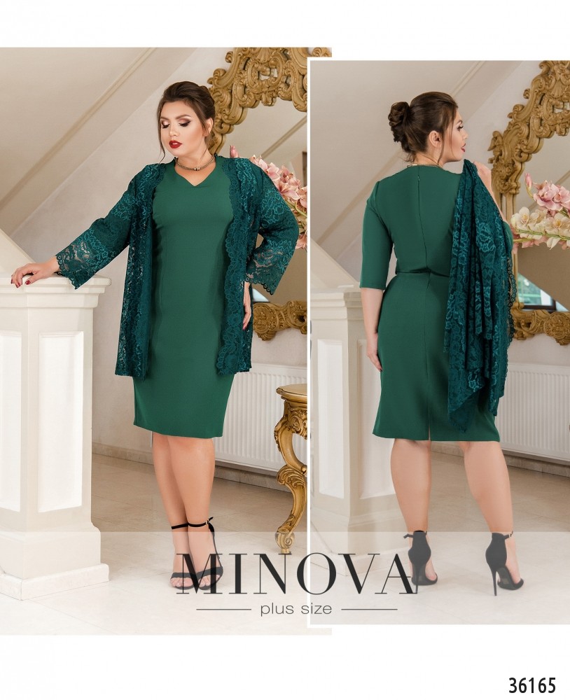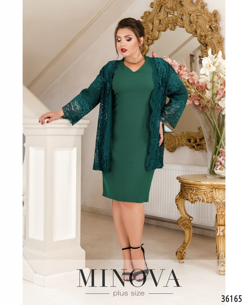 Элегантный костюм-двойка с платьем батал из новой коллекции Minova можно носить и на праздник, и каждый день – для создания праздничного настроения. Накидка из гипюра, без застёжек и карманов, очень нежная и ажурная, словно недлинный пеньюар. Платье из мягкой гладкой ткани, приталенное, с рукавами длиной ¾. Рукава без манжет. На груди вытачки, вырез горловины полукруглый, неглубокий. Наряд однотонный, поэтому вы можете выбирать яркие пёстрые аксессуары в тон или на контрасте. Обувь лучше надевать на каблуке любой высоты.