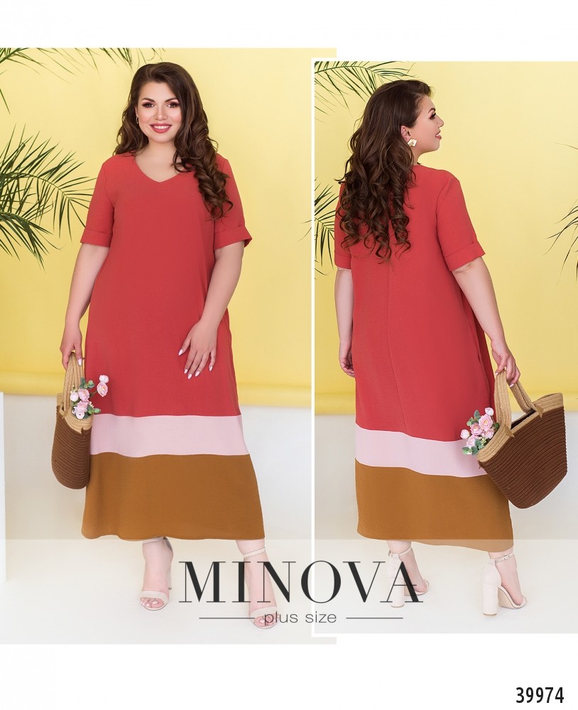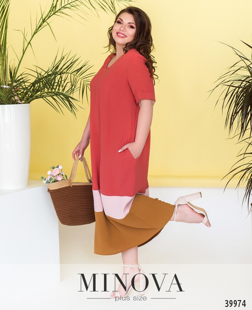 Лёгкое и стильное платье батал с врезными карманами по бокам, рукава короткие, с подворотами, вырез горловины неглубокий, на груди вытачки, застёжек нет.