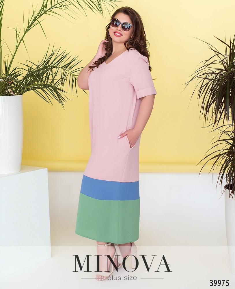 Лёгкое и стильное платье батал с врезными карманами по бокам, рукава короткие, с подворотами, вырез горловины неглубокий, на груди вытачки, застёжек нет.
